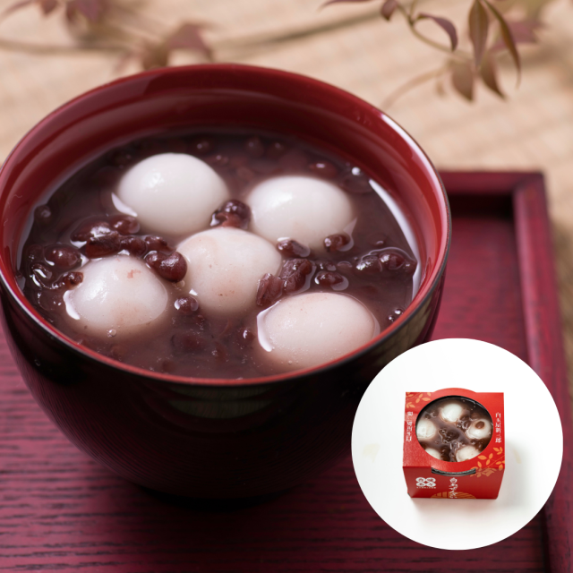 赤の白玉ぜんざいには、北海道産小豆をじっくりと炊き上げた